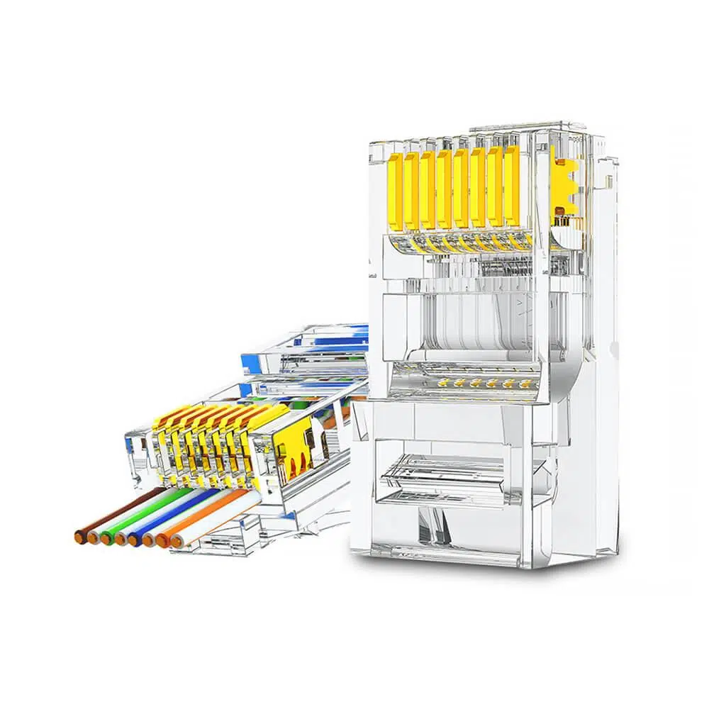 Cat6 RJ45 EZ delikli 50µm konnektörler, Ethernet kablolarının daha kolay ve hızlı bir şekilde bağlanmasını sağlayan özel bir tür konektördür. "Pass-through" özelliği, kabloyu konektöre takarken, kablo ucu konnektörün içinden geçer ve bu sayede daha kolay bağlantı yapılmasını sağlar.
