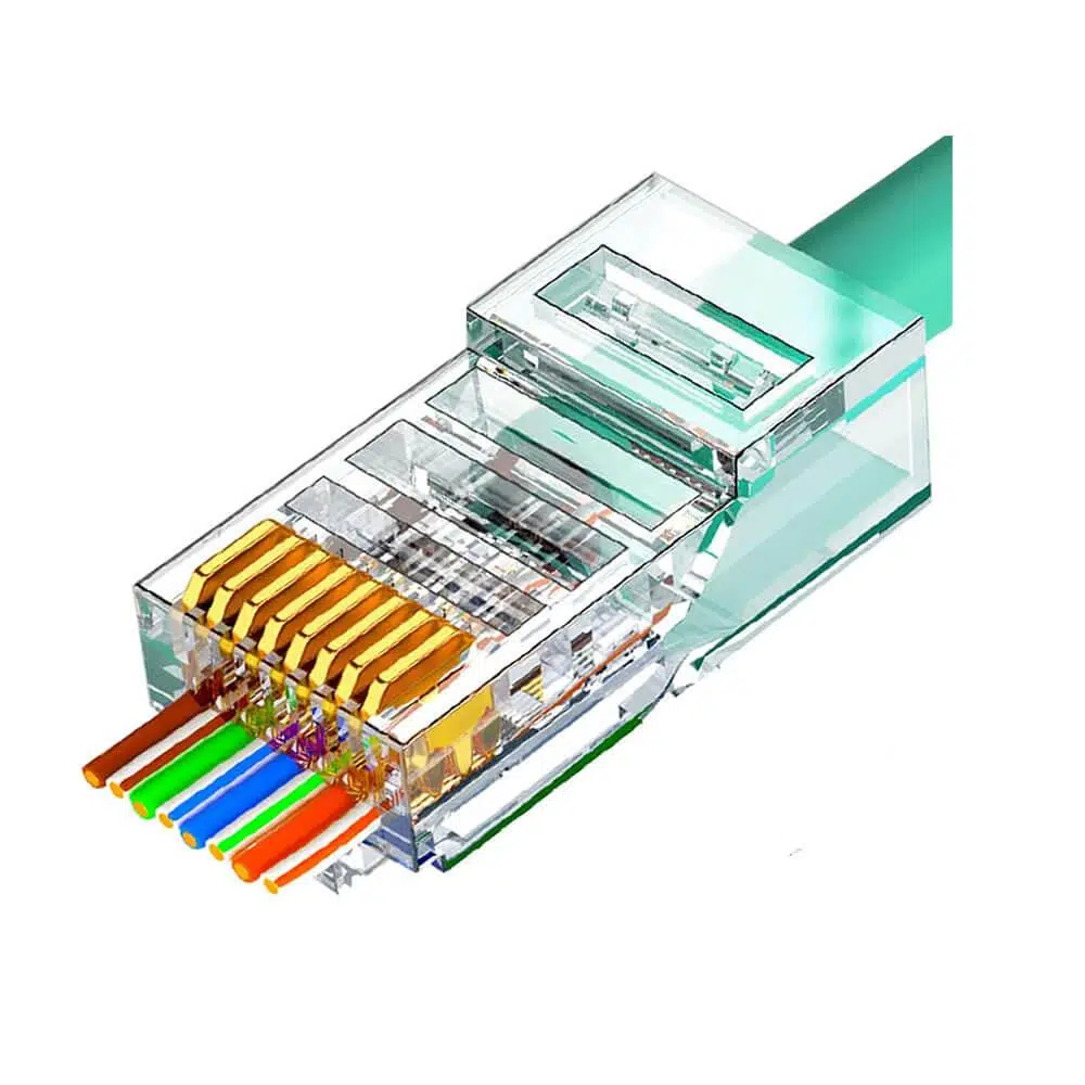 Pass-through Tasarımı: Kablo ucu konektörün içinden geçer, bu da kablonun ucu kesilmeden direkt olarak konektöre takılmasını sağlar. Bu, kurulumun daha hızlı ve kolay olmasını sağlar, özellikle büyük ağ kurulumlarında veya sık sık kablo bağlantısı yapılması gereken durumlarda faydalıdır.