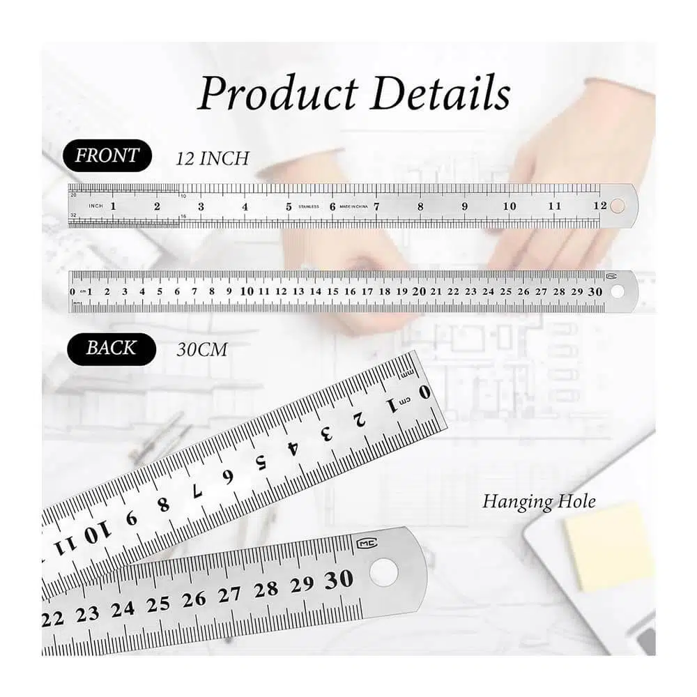 Paslanmaz çelik çift taraflı cetvel, bir yüzünde santimetre ve milimetre, diğer yüzünde inç ölçekleriyle tasarlanmış olup, farklı ölçüm sistemlerine kolaylıkla uyum sağlar.