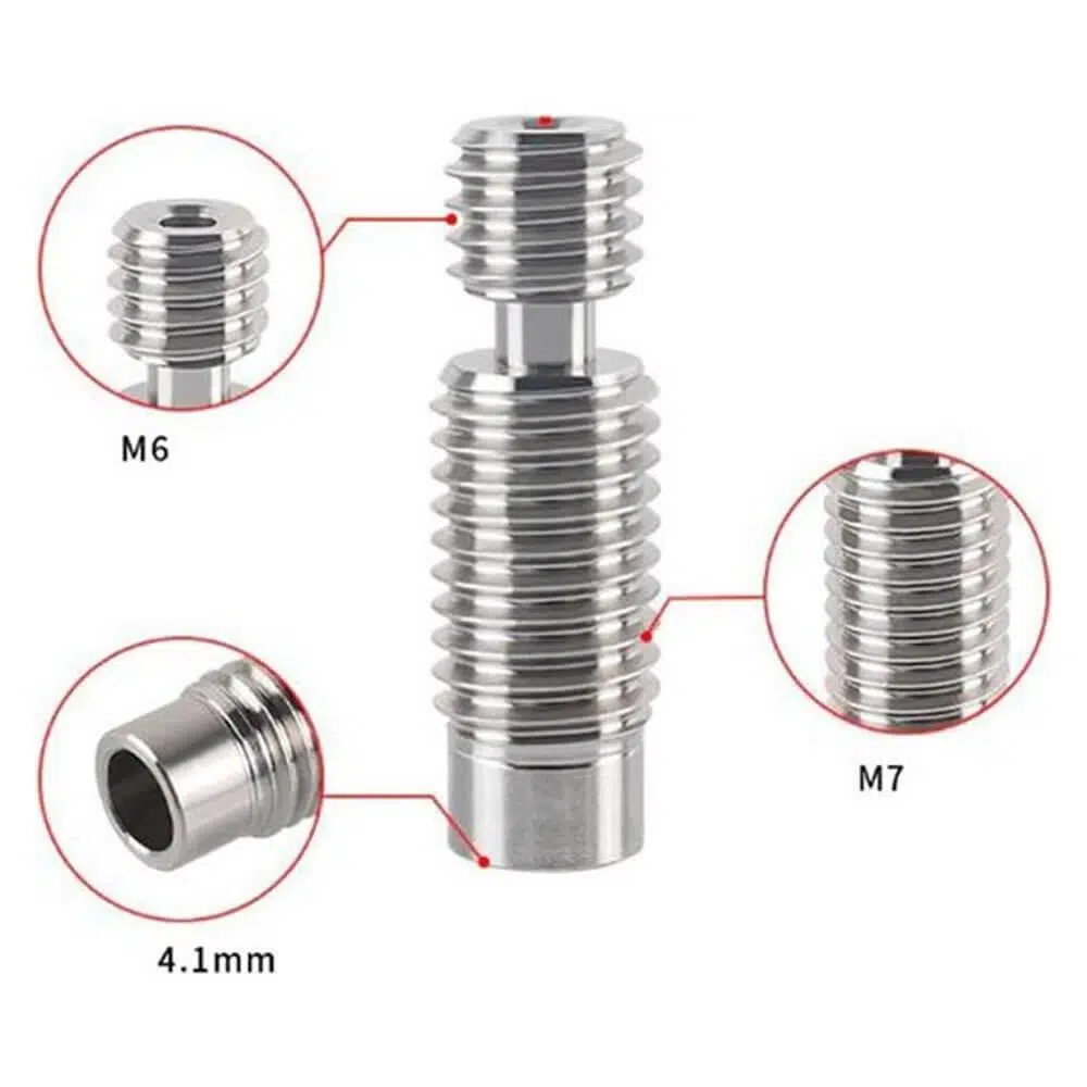 E3D V6 hotendlerle uyumlu M7x22mm boyutlarında bareldir. Soğutucu blok tarafı M7(7mm)'dir. Barelin toplam uzunluğu 22mm'dir.