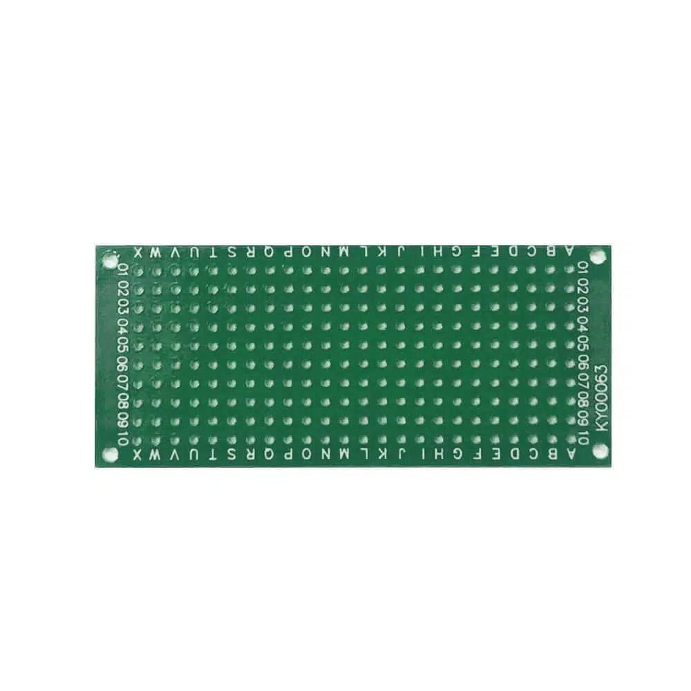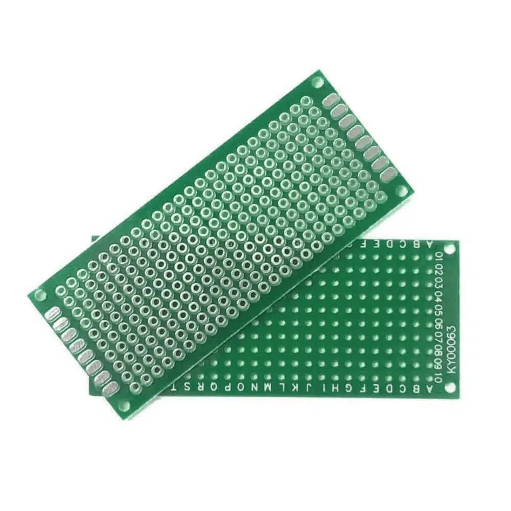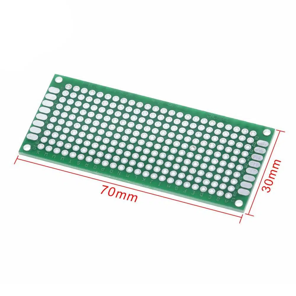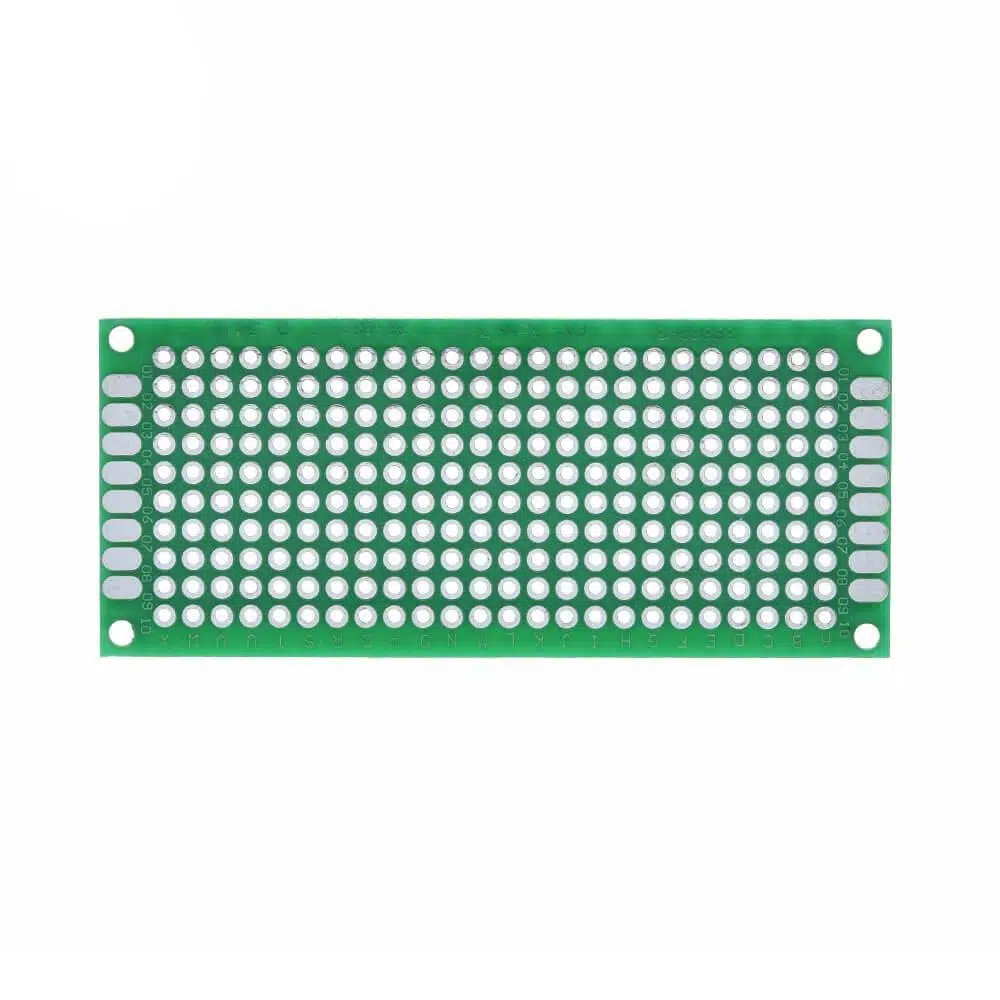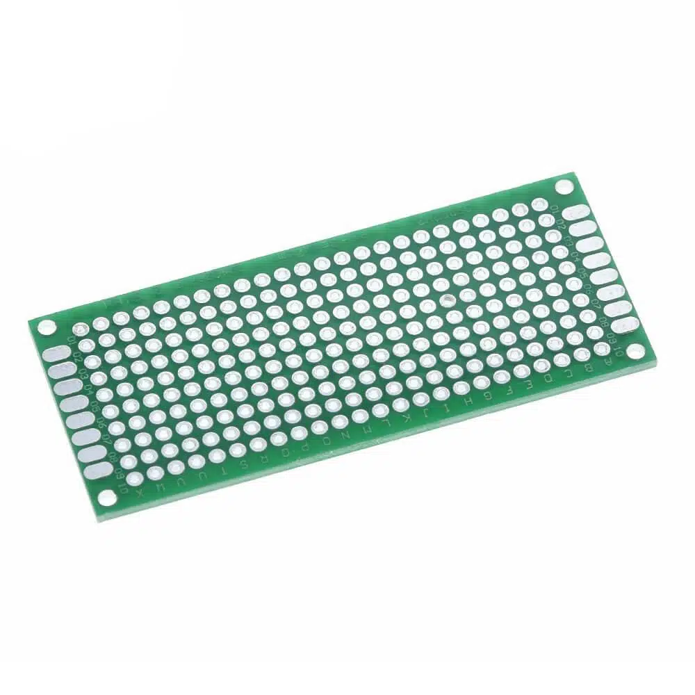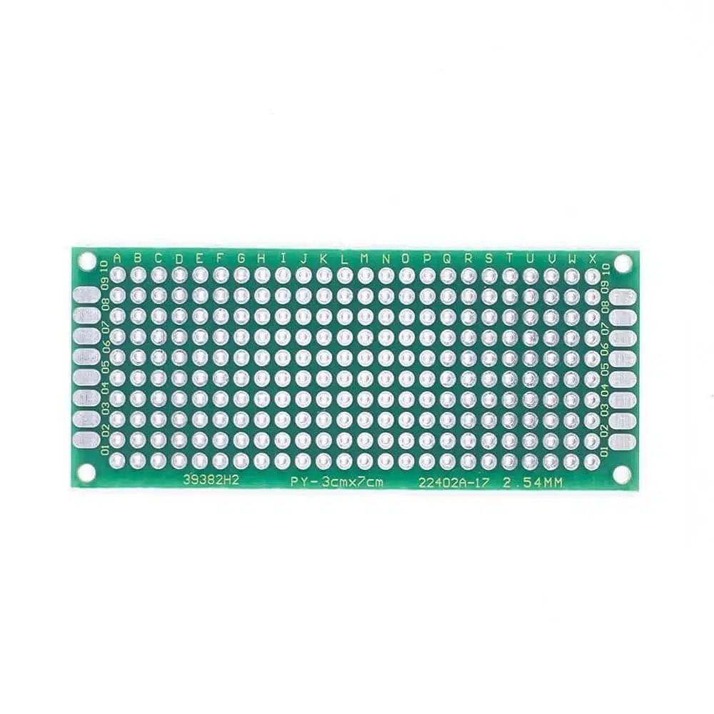3x7 cm boyutunda delikli devre tahtası, elektronik bileşenleri yerleştirmek ve lehimleme yapmak için kullanılan bir tür prototipleme tahtasıdır.