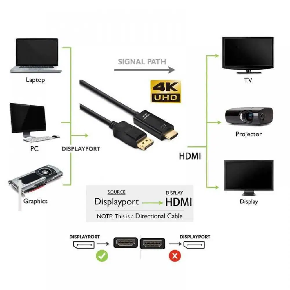 Bu kablo, DisplayPort 1.4 veya daha yeni bir sürümünü destekleyen bir ucu ve HDMI 2.0 veya daha yeni bir sürümünü destekleyen diğer ucu olan bir bağlantı kablosudur. Bu şekilde, DisplayPort çıkışına sahip bir bilgisayar, grafik kartı veya diğer cihazlar ile HDMI girişine sahip bir televizyon, monitör veya projektör gibi cihazlar arasında doğrudan bağlantı sağlar.