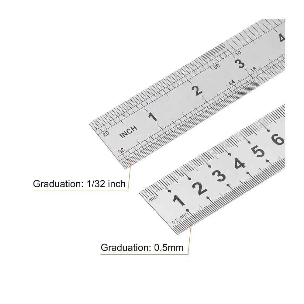 Paslanmaz çelik çift taraflı cetvel, bir yüzünde santimetre ve milimetre, diğer yüzünde inç ölçekleriyle tasarlanmış olup, farklı ölçüm sistemlerine kolaylıkla uyum sağlar.