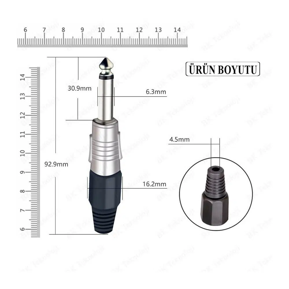 6.35 mm Mono Erkek Fiş Lehim Tipi Jack Konnektörü, profesyonel ses kalitesi ve uzun ömürlü kullanım sunan yüksek performanslı bir bağlantı ekipmanıdır. Bu lehim tipi jack, gitar, bas gitar, klavye, mikser, amfi, pedallar, mikrofon ve ses sistemleriyle tam uyumluluk sağlar. Sahne sanatçılarından ev stüdyosu kullanıcılarına kadar herkes için idealdir.