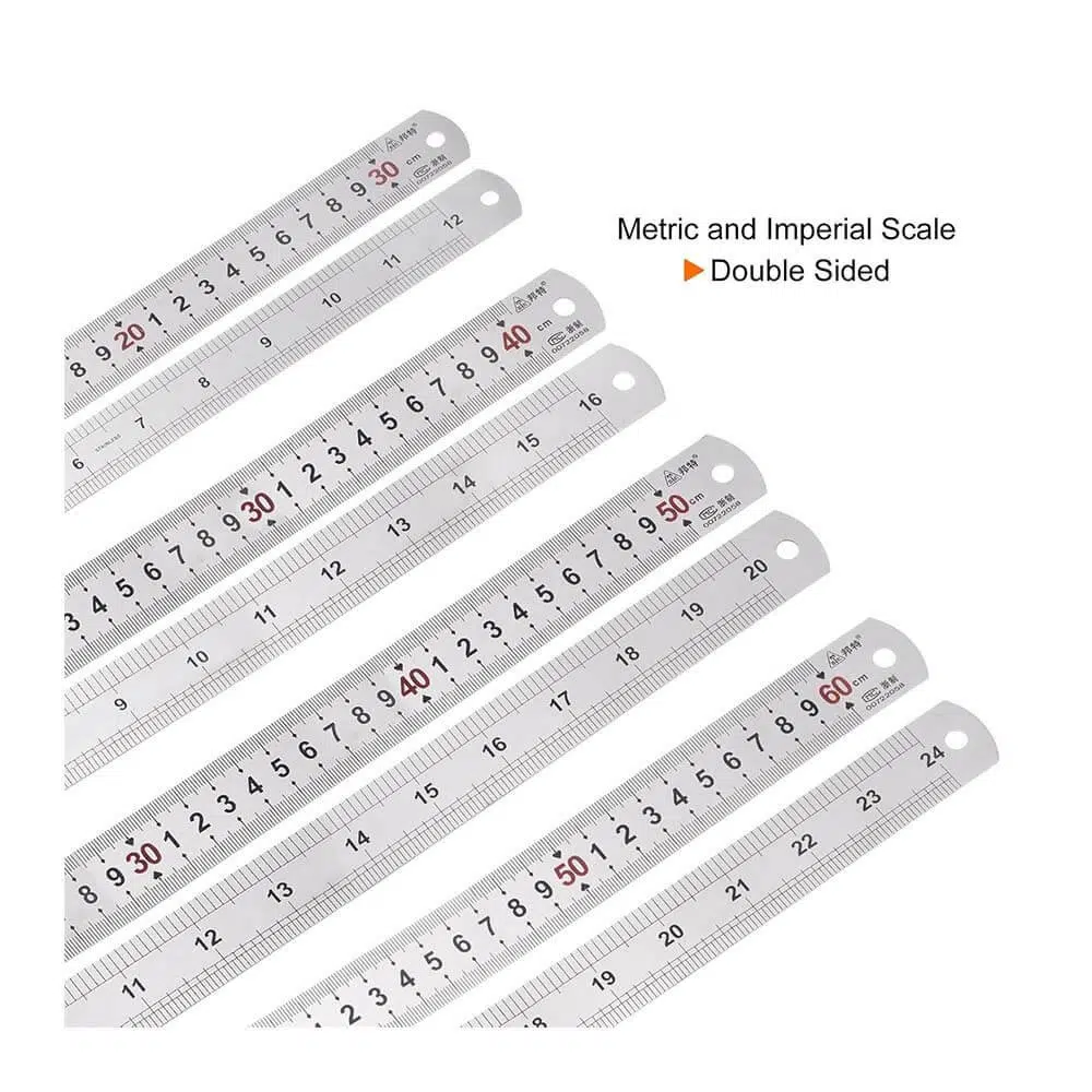 Paslanmaz çelik çift taraflı cetvel, bir yüzünde santimetre ve milimetre, diğer yüzünde inç ölçekleriyle tasarlanmış olup, farklı ölçüm sistemlerine kolaylıkla uyum sağlar.