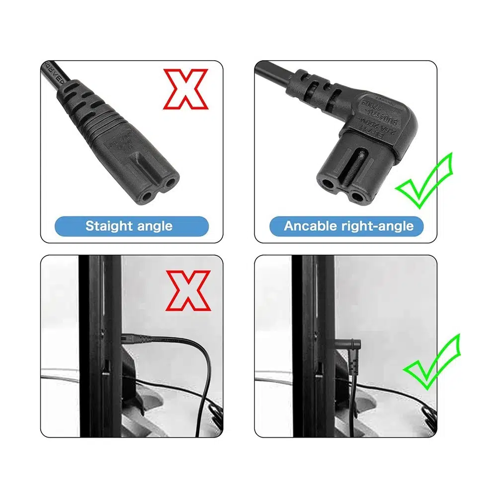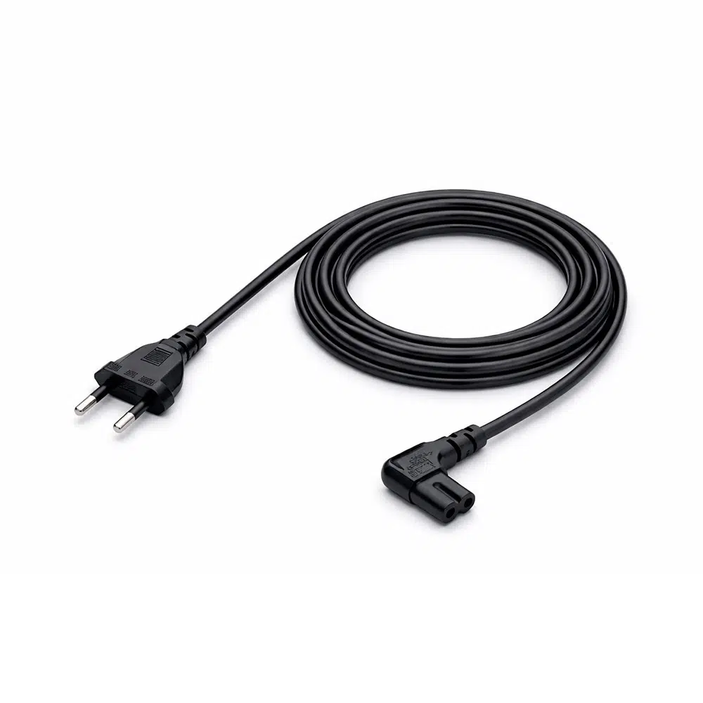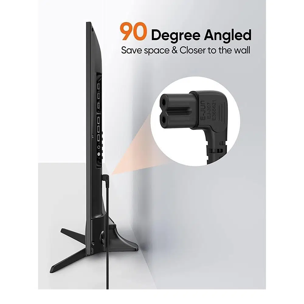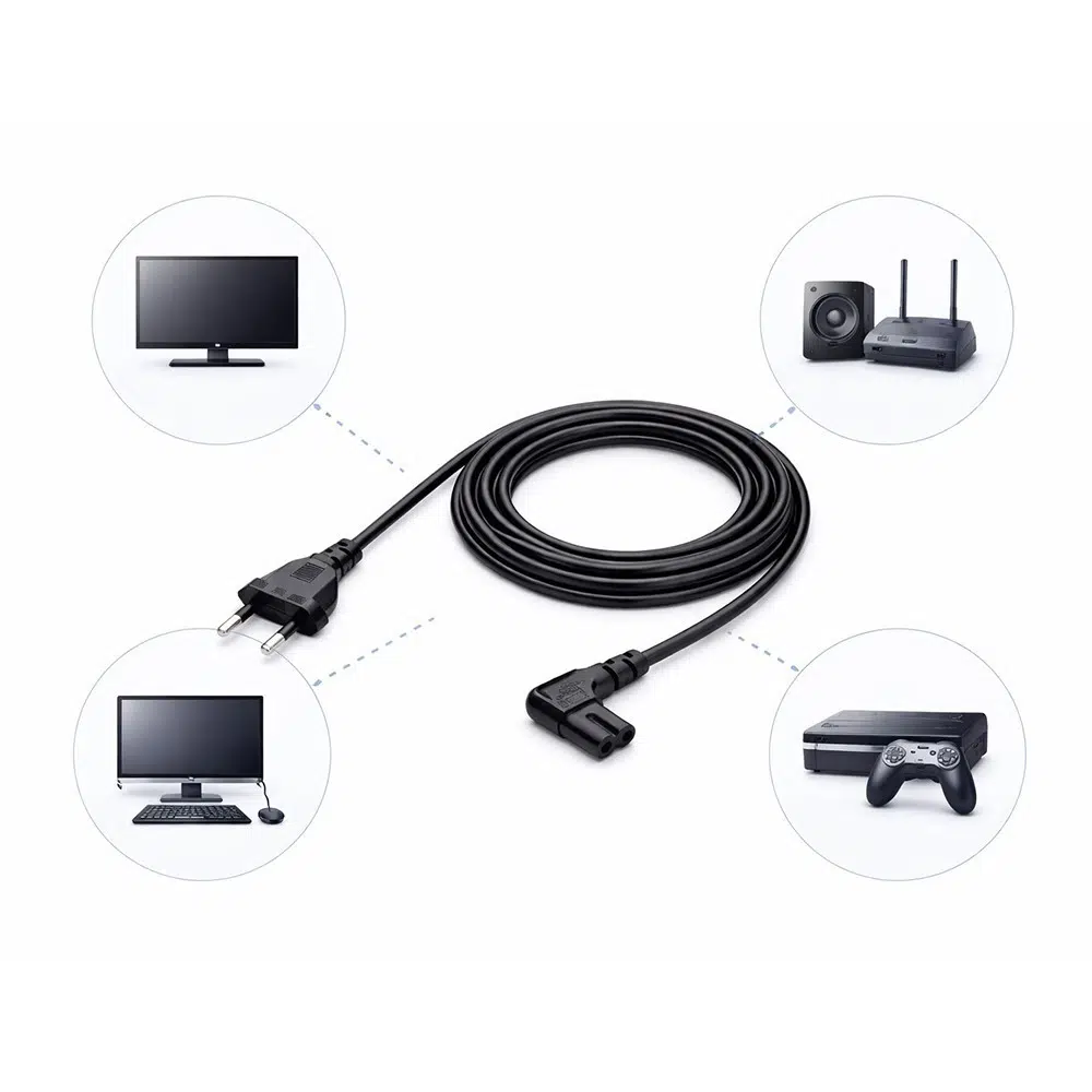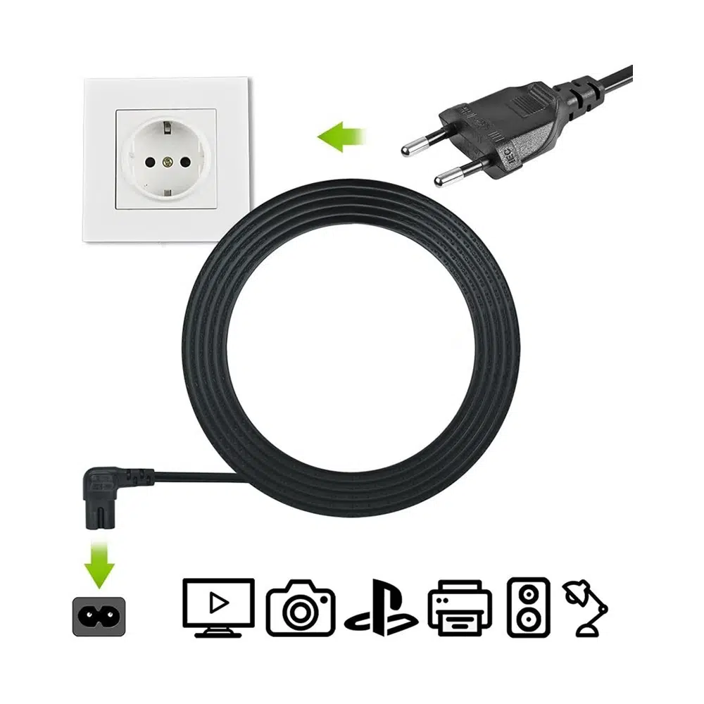 Cihazınızın arkasındaki giriş yuvası iki delikli ve sekiz rakamına benziyorsa, bu güç kablosu cihazınızla tam uyum sağlayacaktır. Özellikle dar raf sistemleri, dar TV üniteleri ve mobilya arkasında kalan prizler için 90 derece soket yapısı, kablo karmaşasını önler ve estetik bir görünüm sunar.