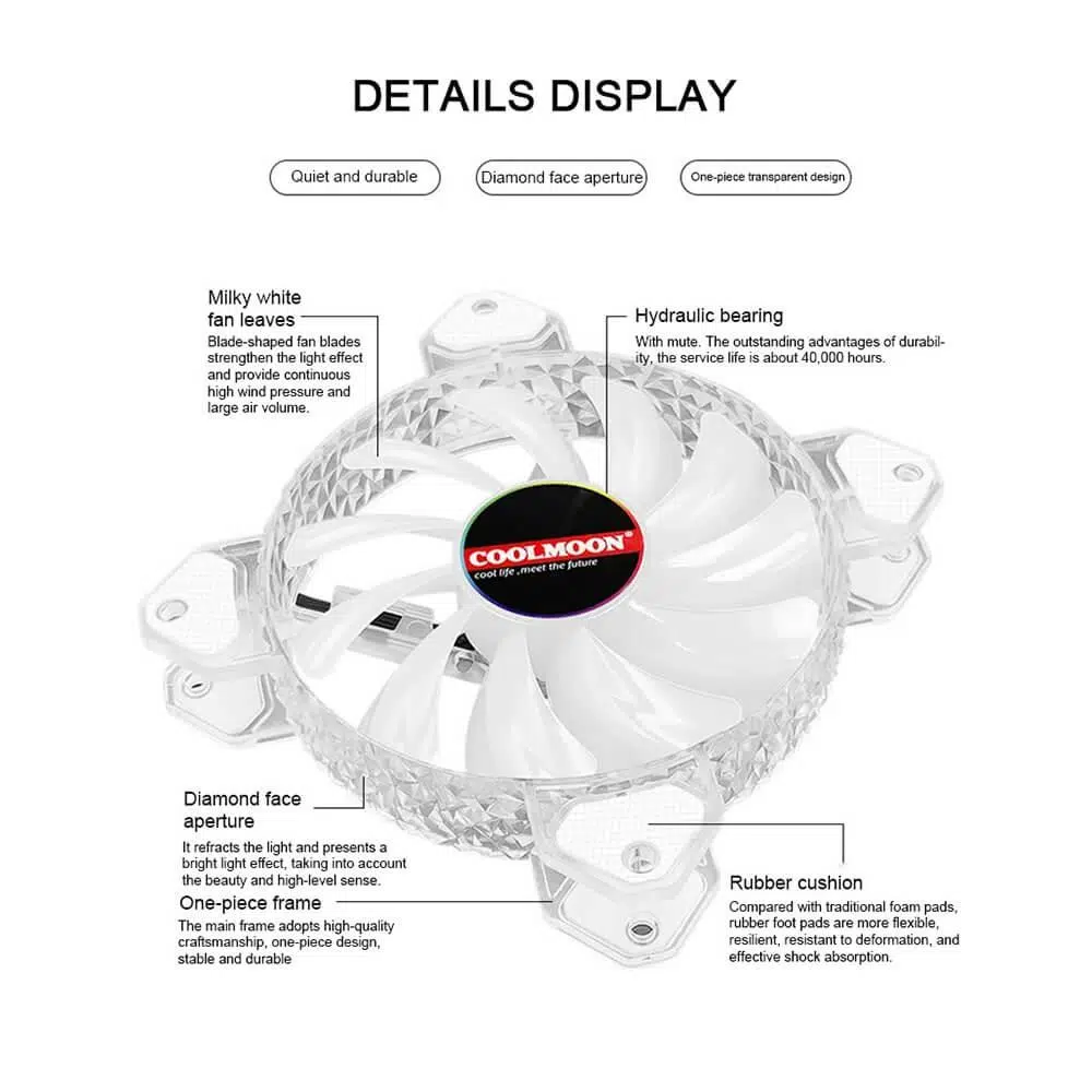 Coolmoon kristal elmas yüzeyli 12cm 6 pin RGB kasa fanı, bilgisayarınızın görünümünü iyileştirmek ve performansını artırmak için mükemmel bir seçenektir. Göz alıcı tasarımı ve RGB aydınlatmasıyla dikkat çekerken, sessiz çalışmasıyla da kullanıcıların memnuniyetini sağlar.
