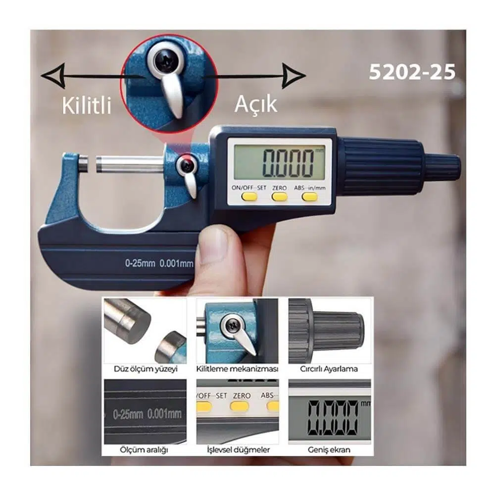 Bu dijital mikrometre, yüksek hassasiyeti, sağlam yapısı ve kullanıcı dostu özellikleri ile profesyonellerin ve hassas ölçüm gerektiren tüm kullanıcıların ihtiyaçlarını karşılamak üzere tasarlanmıştır. Kolay okunabilir ekranı, sıfırlama fonksiyonu ve sağlam dış yapısı ile uzun ömürlü ve güvenilir bir ölçüm deneyimi sunar.