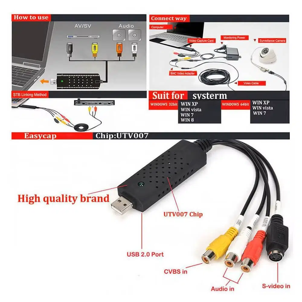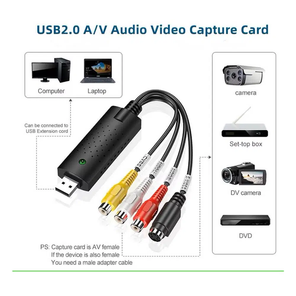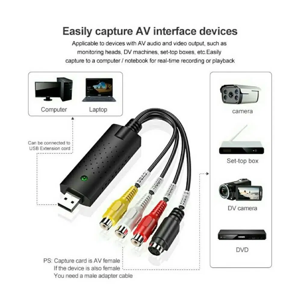 Video kasetlerinizi, DVD kayıtlarınızı ve eski kameralarınızı dijital ortama aktarmanın en kolay yolu! Easycap USB 2.0 Video Capture Adaptörü ile nostaljik anılarınızı bilgisayarınıza kaydedebilir, düzenleyebilir ve istediğiniz formatta arşivleyebilirsiniz.