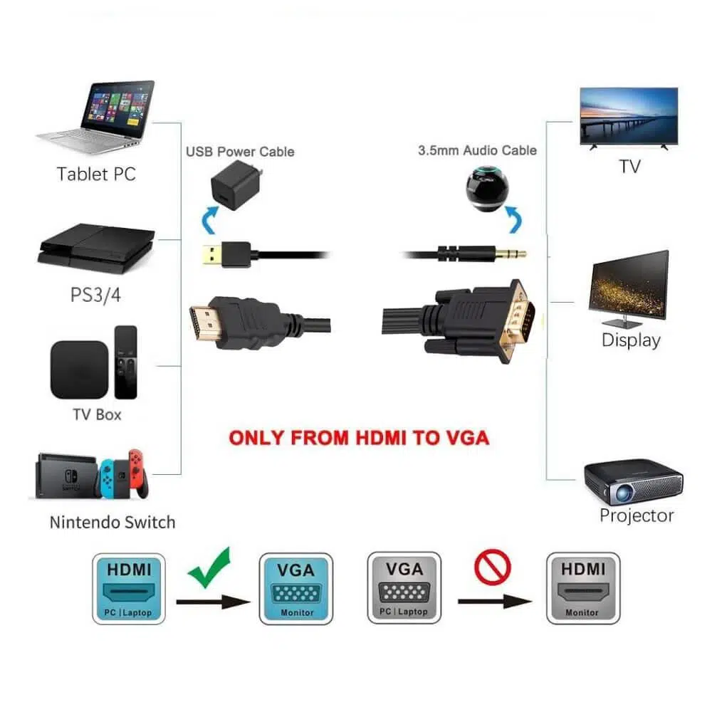 3 metre uzunluğunda, 1080p çözünürlükte HDMI to VGA kablo, bir cihazın HDMI çıkışını (genellikle bir bilgisayar, DVD oynatıcı veya oyun konsolu gibi modern cihazlar) bir VGA girişine (genellikle eski monitörler veya projektörler gibi daha eski cihazlar) bağlamak için kullanılan bir adaptördür. Ayrıca, bu kablolar genellikle ses iletimi için bir 3.5mm ses kablosu ve güç için bir USB kablosu ile birlikte gelir.