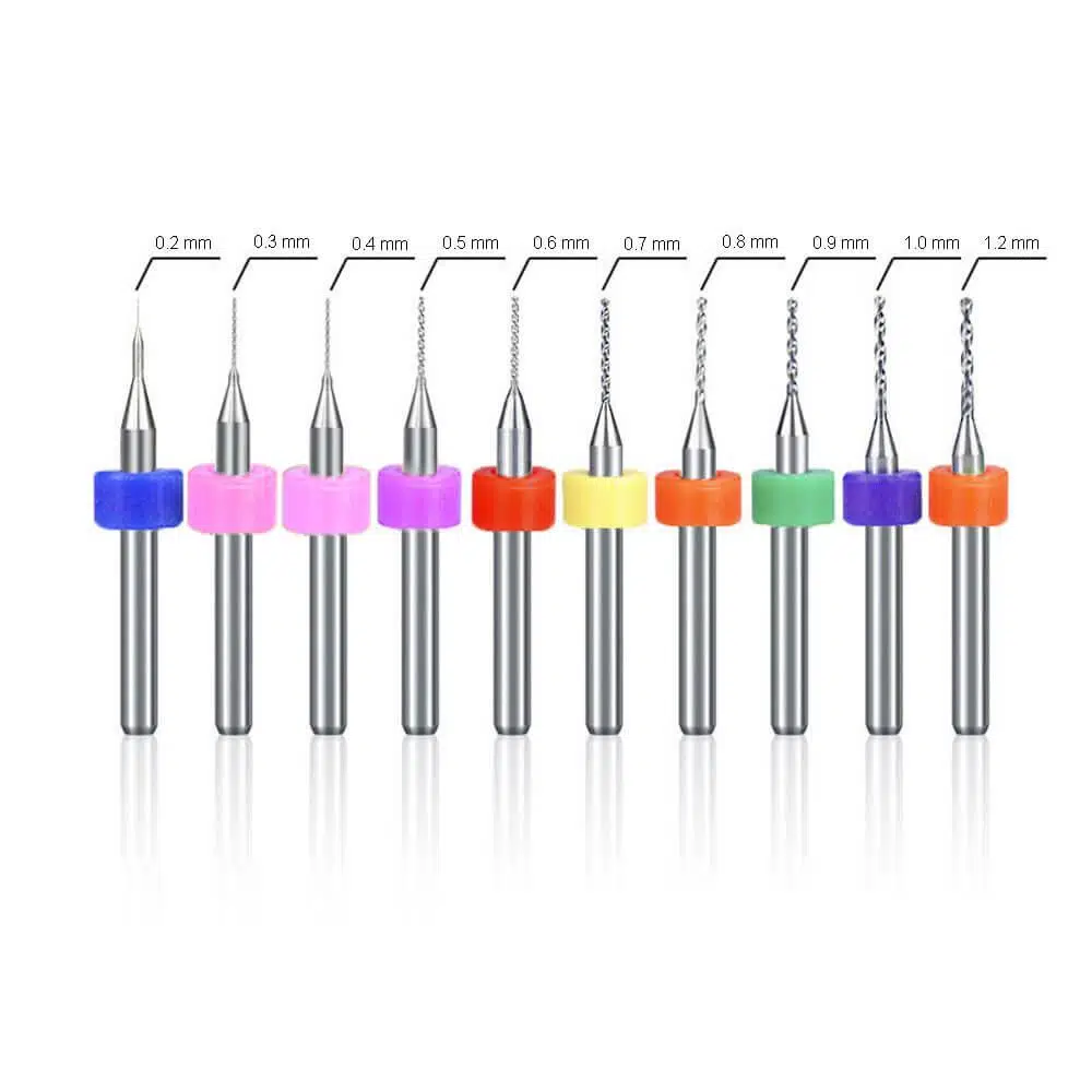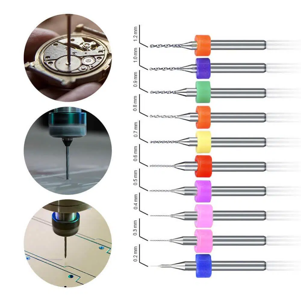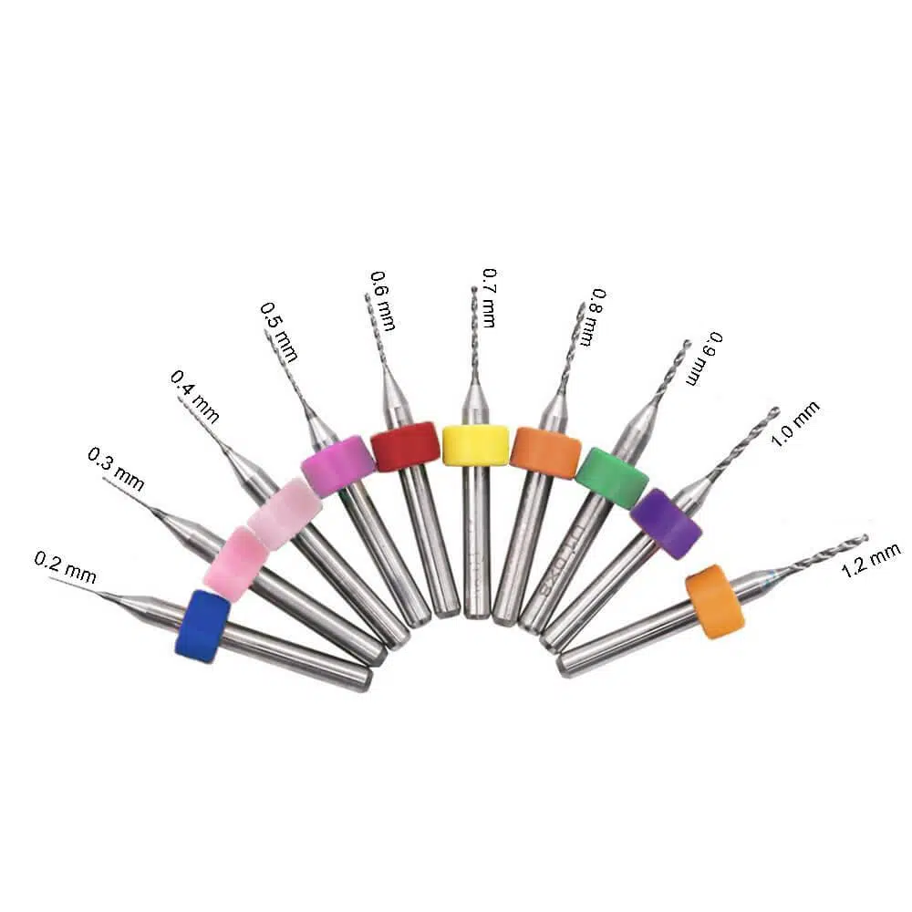 0.2, 0.3, 0.4, 0.5, 0.6, 0.7, 0.8, 0.9, 1.0, 1.2mm uç çapında 10 adet mikro Matkap ucu setidir.