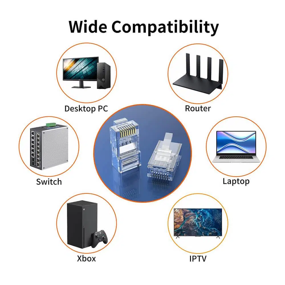 RJ45 Standartlarına Uyum: RJ45 konektörler, ağ kablolarını bağlamak için yaygın olarak kullanılan standart konektörlerdir. Cat6 3U" konnektörler, RJ45 standartlarına uygun olarak tasarlanmıştır ve standart RJ45 soketlere uyumludur.