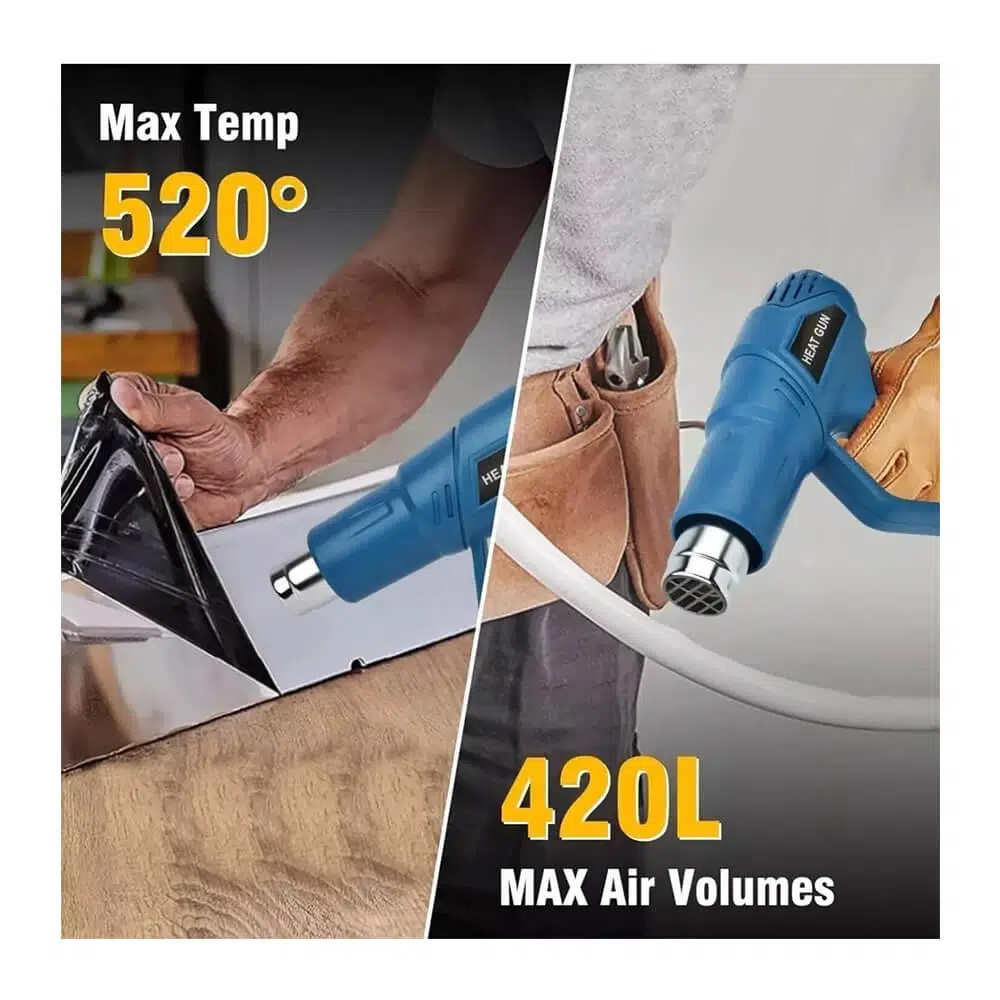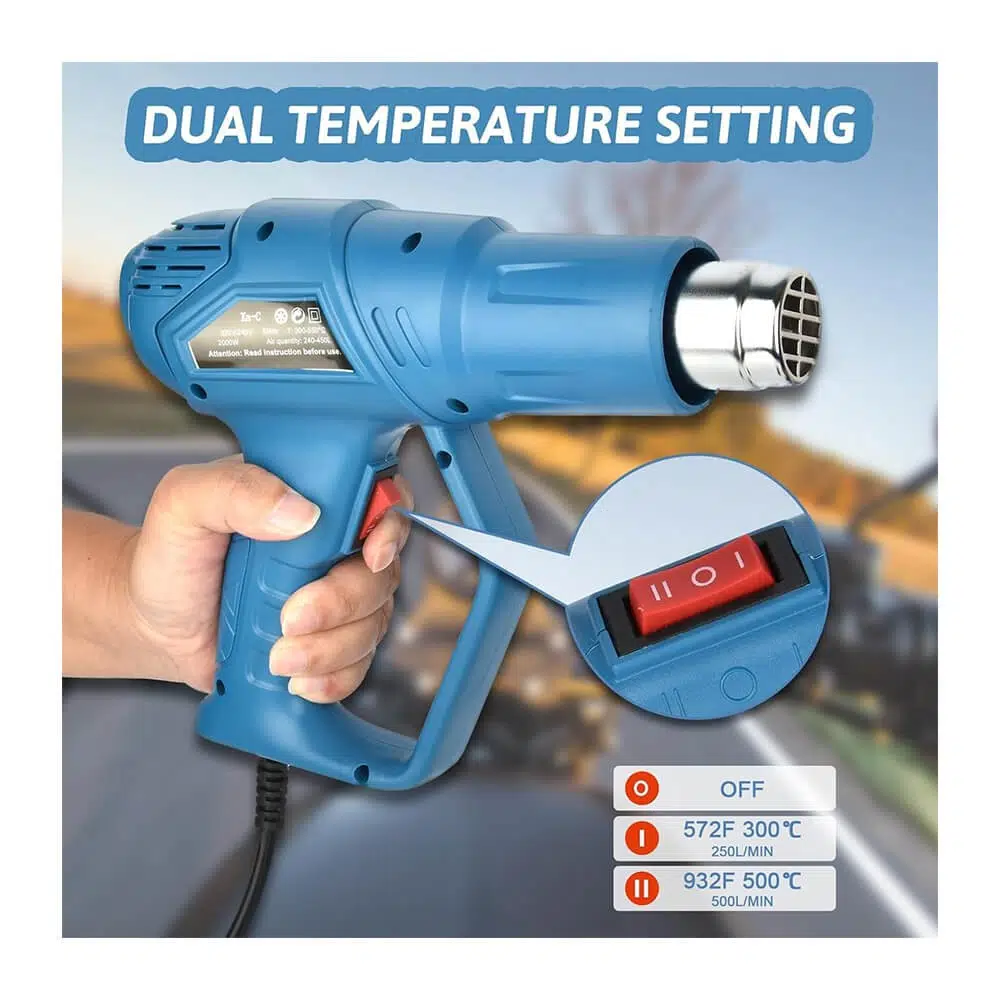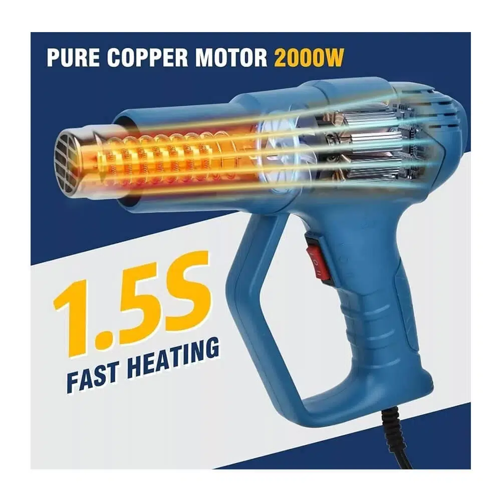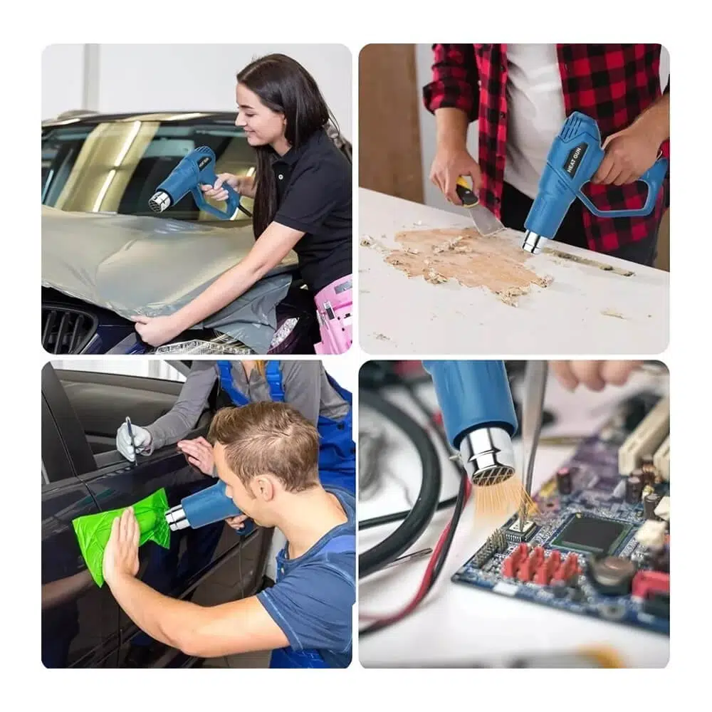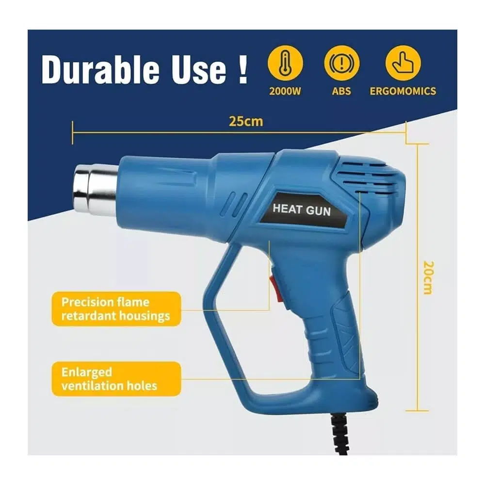 Bu çok fonksiyonlu 2000W sıcak hava tabancası; araba cam filmi uygulamadan ambalaj poşeti daraltmaya, paslı vidaları gevşetmeden boya sökümüne kadar birçok farklı işte kullanılabilir. Ergonomik tasarımı, yüksek ısı kapasitesi ve dayanıklı malzemesiyle hem profesyonellerin hem de DIY kullanıcılarının gözdesi.